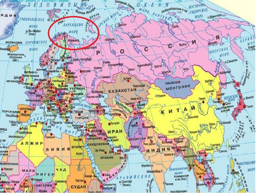 Как видно из карты, которая дана ниже в приложении, Баренцево море расположено на севере Евразии и омывает берега как России, так и Норвегии.