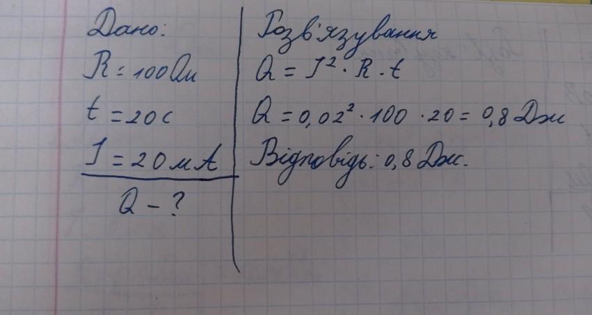 какое количество теплоты выдкляется в проводнике сопротивлением 100 Ом за 20 с при силе тока в цепи 20 мА