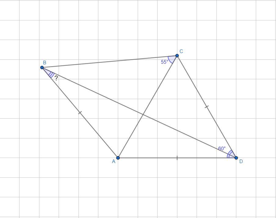 В выпуклом четырёхугольнике ABCD известно что угол ADC равен 60 градусов и AB = AD=DC найдите ABD если известно угол BCA= 55 градусов