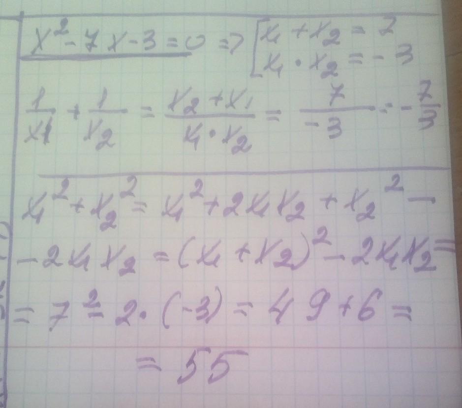 Відомо що х1 і х2 корені рівняння х(в квадраті) - 7х-3=0. Не розв'язуючи рівняння знайдіть значення виразу