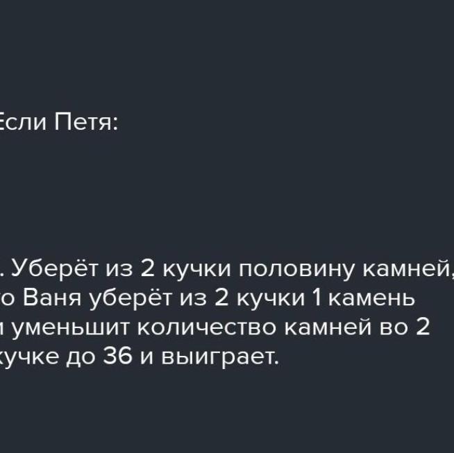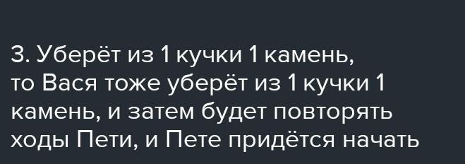 последний камень из последней кучи, считается победителем. Петя, который ходит