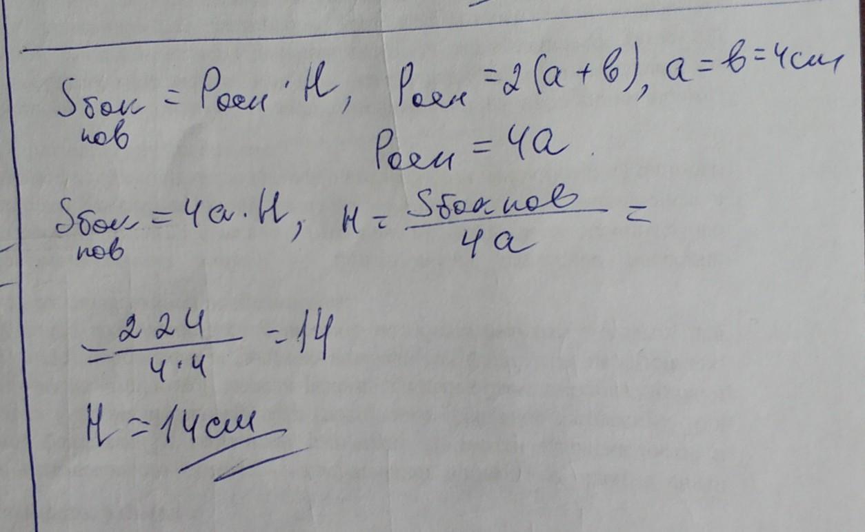 У прямоугольного параллелепипеда стороны основания равны 4 см и 4 см, а боковая поверхность — 224 см2.