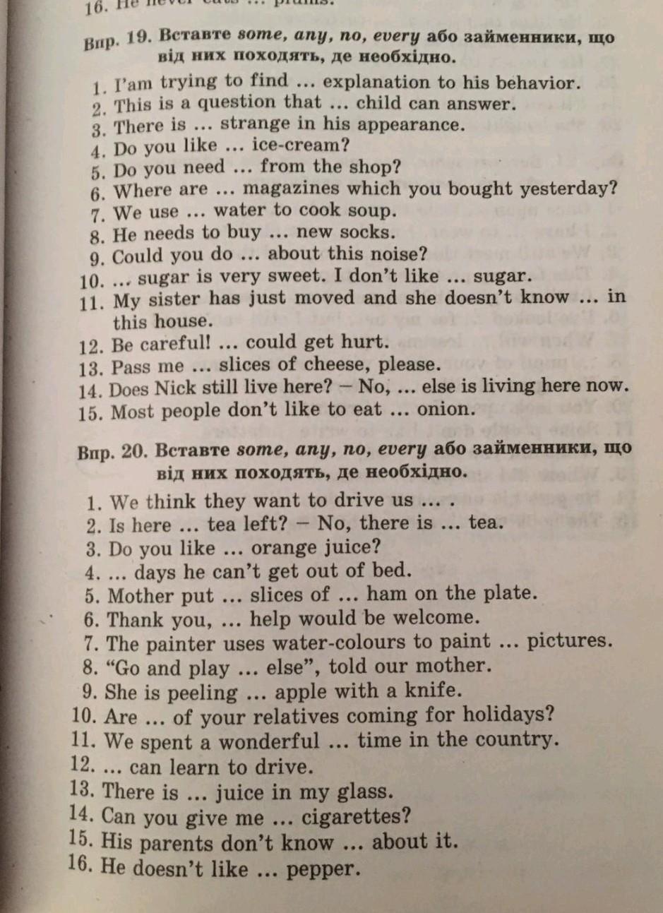 1 any 2 every 3 something/nothing 4 - 5 anything 6 some 7 some 8 - 9 anything 10 -,- 11 anybody 12 somebody 13 some 14 somebody 15 -