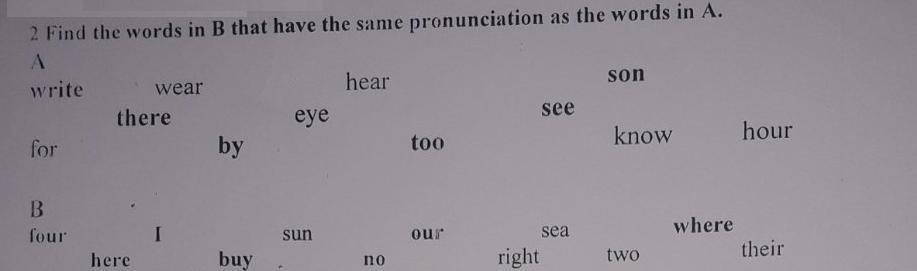 write - right, eye - I, too - two, hour - our, son - sun, where - wear, there - their , for - four, sea - see, know - no, by - buy, hear - here