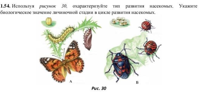 Используя рисунок 30, охарактеризуйте тип развития насекомых. Укажите биологическое значение личиночной стадии в цикле развития насекомых