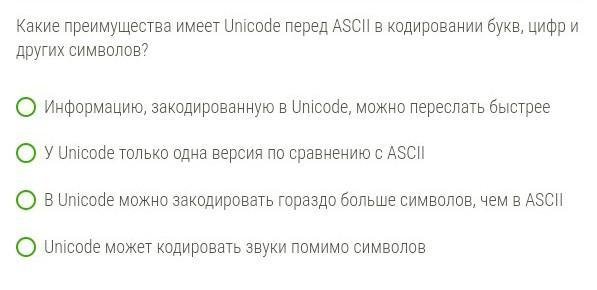 Юникоде для кодирования символа используется 2 байта, а в ASCII - 3, поэтому в Юникод можно закодировать в 2^8 раз больше символов, чем asc. Например, с его помощью кодируются и китайские иероглифы (коих тьма тьмущая)