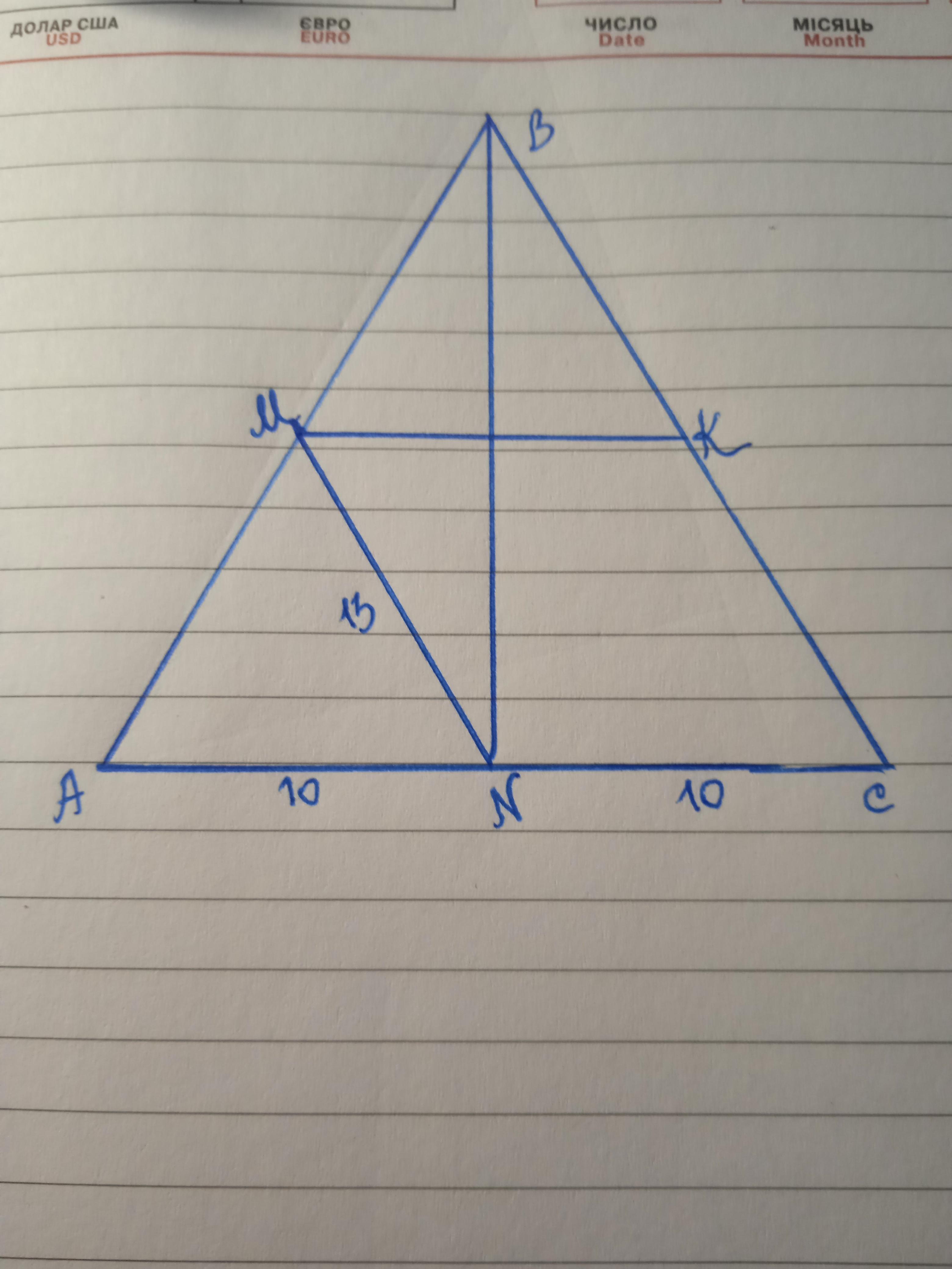 Дано: ΔАВС; АВ=ВС; МК, МN - средние линии; MN=13; BN=24. Найти МК.
