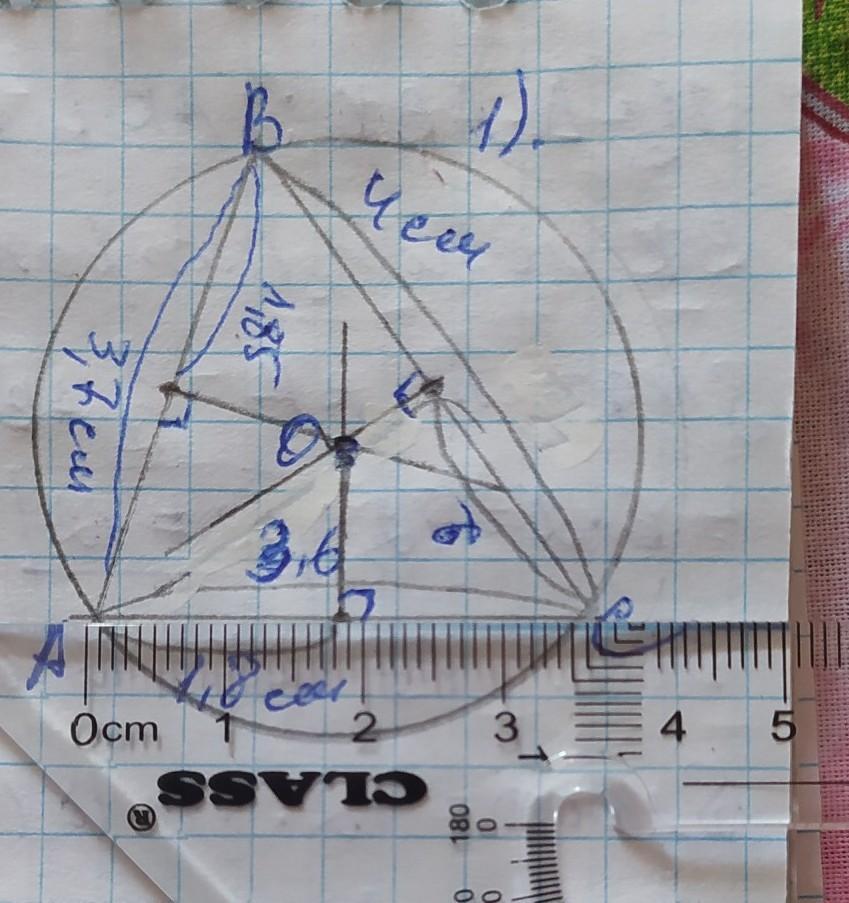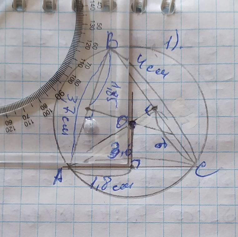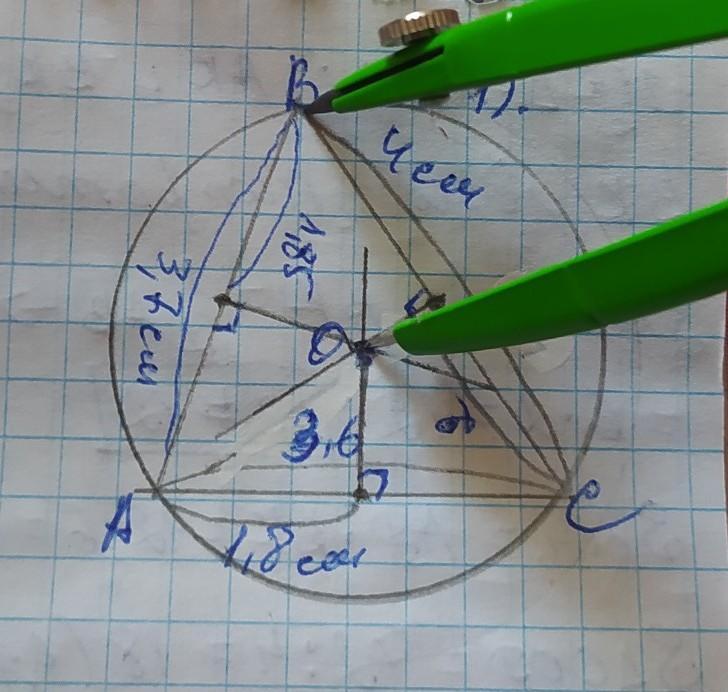 Отмечаем точку пересечения перпендикуляров О и фиксируем на ней острую ножку циркуля. Радиус описанной окружности - это расстояние от центра окружности к любой вершине треугольника.