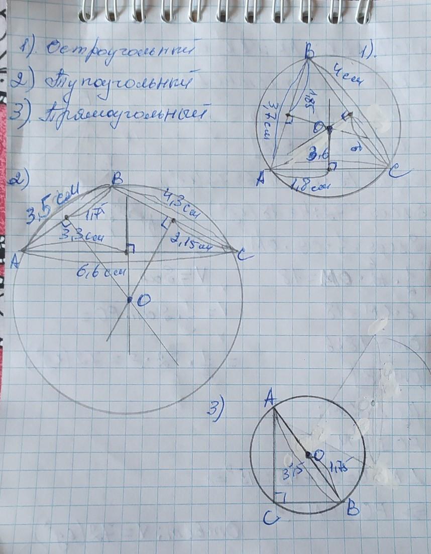 Находим в ней середину по тому же принципу, что и в предыдущих треугольниках и радиусом будет расстояние от центра окружности до любой вершины треугольника. В данном случае гипотенуза равна 3,5см, тогда расстояние от точки О до вершины=3,5÷2=1,75см.