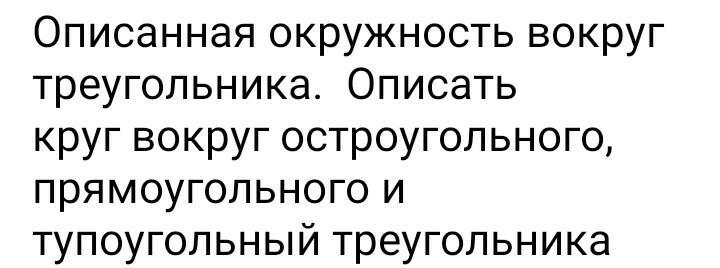 центр описанной окружности в остроугольном и тупоугольном треугольнике - точка пересечения их серединных перпендикуляров.