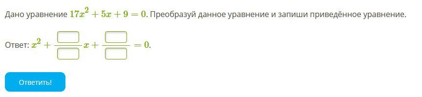 Дано уравнение 17x2+5x+9=0. Преобразуй данное уравнение и запиши приведённое уравнение.