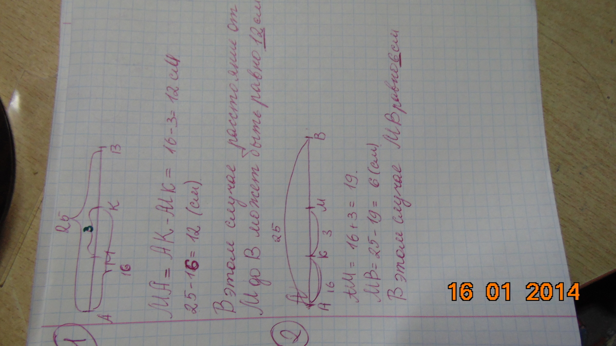 На отрезке АВ длиной 25 см отметилиточки К и М так, что расстояние от А до К равно 16см, и расстояние от К до М равно 3см. Может ли расстояние между точками М и В быть равным 12 см?