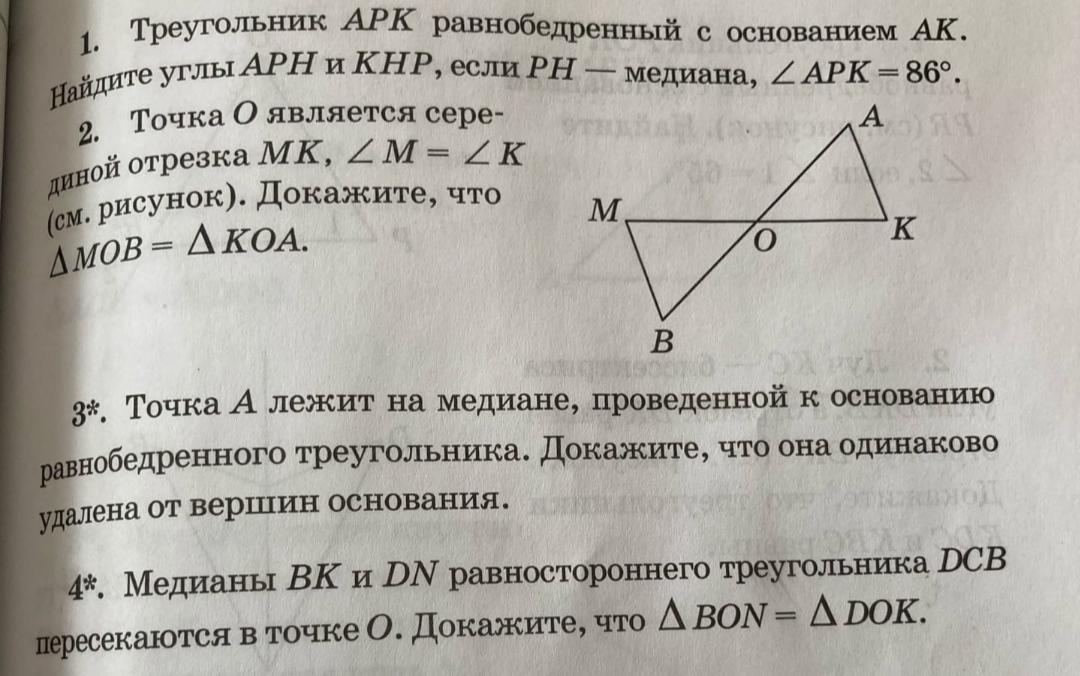 2) Треугольники MOB и KOA равны по стороне и двум углам: