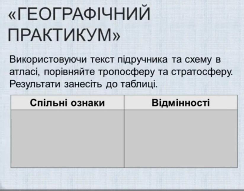 У тропосфері міститься майже вся водяна пара, з якої утворюються хмари, а потім і опади. Стратосфера розміщується над тропосферою до висоти 55 км. Повітря там дуже розріджене. У ньому майже немає домішок і водяної пари. На висоті 20—З0 км концентрується озон, утворюючи озоновий шар. Він затримує ультрафіолетове випромінювання Сонця, шкідливе для всього живого на Землі. Отже, перша відмінність розмінюються на різній висоті, друга відмінність - у тропосфері повітря дуже щільне (80% всього повітря), а у стратосфері - повітря розріджене; третя відмінність - у тропосфері розміщена водяна пара, там утворюються опади, хмари, а у стратосфері - водяна пара відсутня та четверта відмінність - у стратосфері є озоновий шар, а у тропосфері його не має.