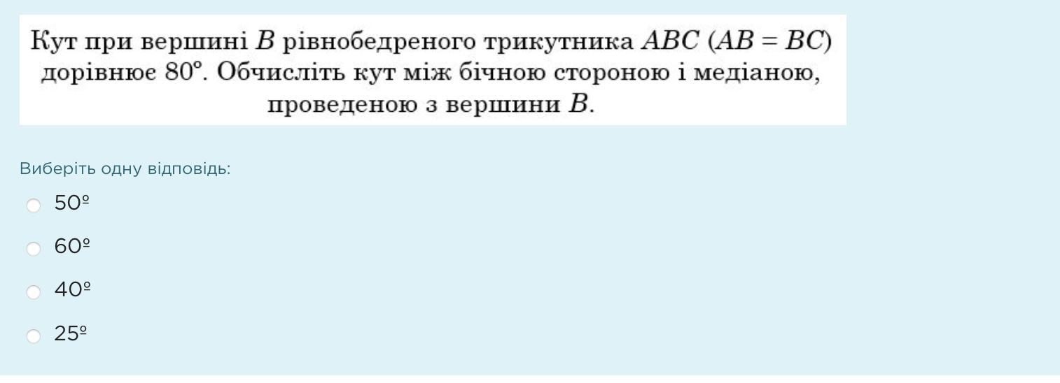 т.к. треугольник равнобедренный => медиана является биссектрисой => угол между АВ и медианой - 80/2=40