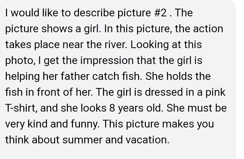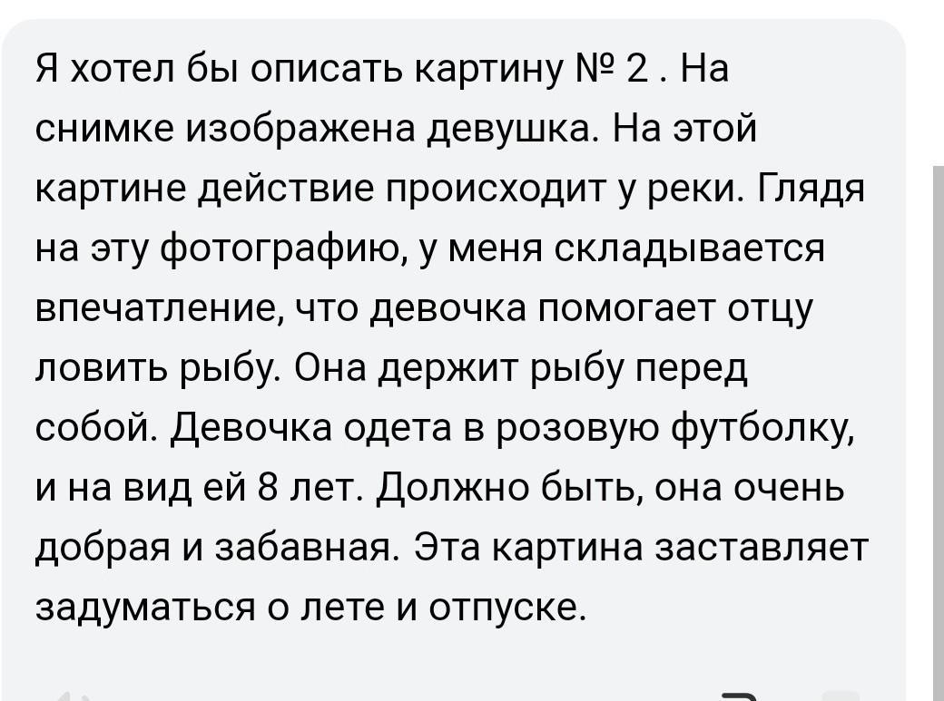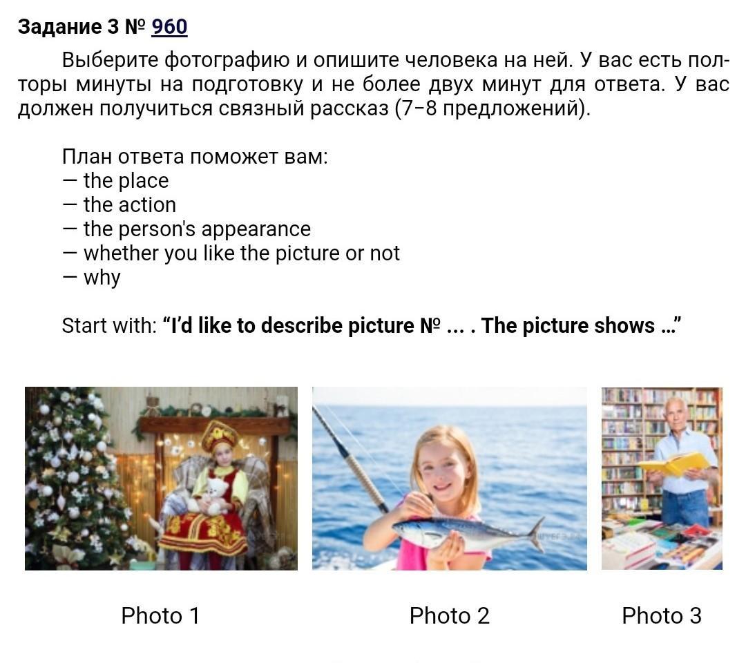 образец: I’d like to describe picture № 3. The picture shows us a man. The photo was (probably) taken inside. In this picture, the action is taking place in the room. Looking at this picture I get the impression that the man is in the library and he is reading a book. He is holding the book in front of him. The man is wearing casual clothes and looks like he is about 60 years old. I guess he is quiet and kind because he has a kind smile. I like the picture because the atmosphere is peaceful. It makes me think of my childhood and my favourite library.(это по 3 фоту)