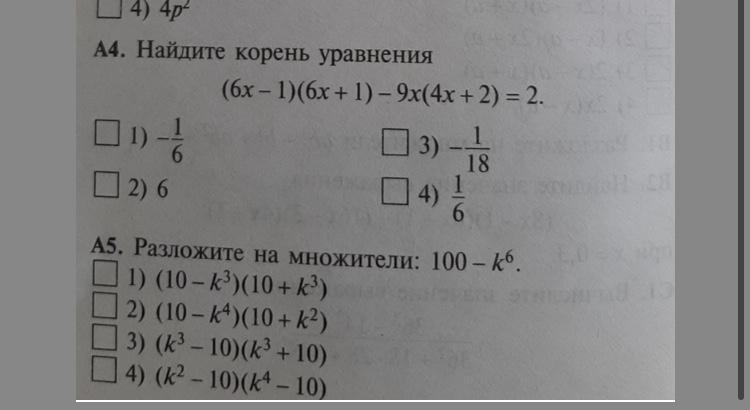 A5. 100-k^6=(10)^2-(k^3)^2=(10-k^3)*(10+k^3) - т. е. ответ №1).