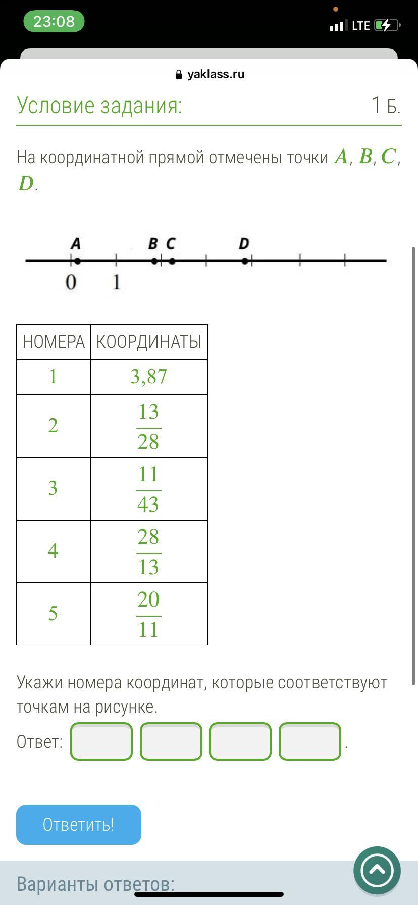На координатной прямой отмечены точки , , , . Укажи номера координат, которые соответствуют точкам на рисунке.