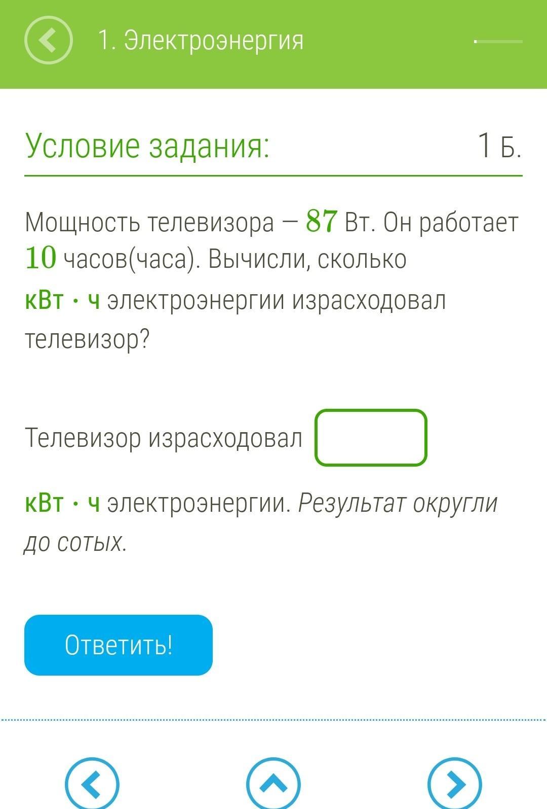 Мощность телевизора — 87 Вт. Он работает 10 часов(часа). Вычисли, сколько кВт⋅ч электроэнергии израсходовал телевизор?