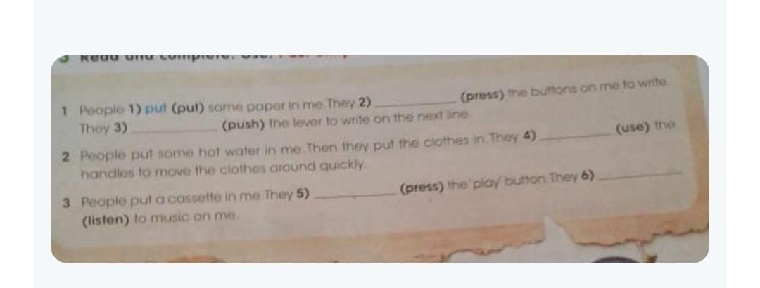 People 1) put (put) some paper in me. They 2) _________ (press) the buttons on me to write. They 3) __________ (push) the lever to write on the next line. I am a 4) _____________.