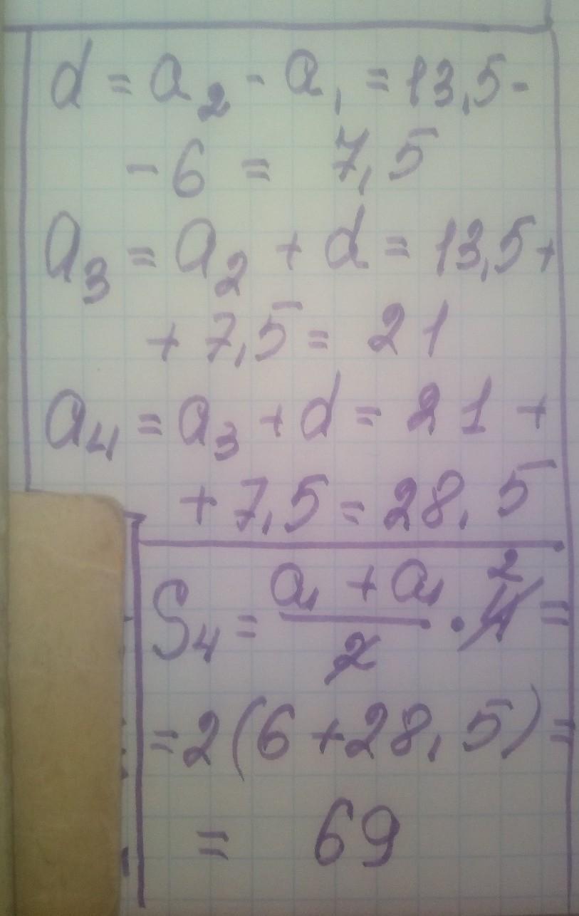 знайди наступні два члени арифметичної прогресії та суму перших чотирьох членів якщо а1 = 6 і а2 = 13,5