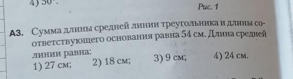 сумма длины средней линии треугольника и длины соответствующего основания равна 54 см. Длина средней линии равна: