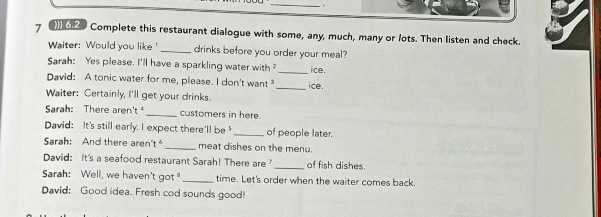 Complete this restaurant dialogue with some, any, much, many or lots. Then listen and check. Waiter: Would you like' Sarah: Yes please. I'll have a sparkling water with ? drinks before you order your meal? ice. David: A tonic water for me, please. I don't want 3 ice, Waiter: Certainly, I'l get your drinks. Sarah: There aren't 4 customers in here. David: It's still early. I expect there'll be 5 рeople later. Sarah: And there aren't meat dishes on the menu. David: It's a seafood restaurant Sarah! There are ? of fish dishes. Sarah: Well, we haven't got 8 time. Let's order when the waiter comes back. David: Good idea. Fresh cod sounds good!