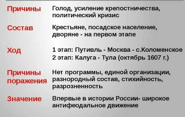 Восстание Болотникова, в отечественной историографии именовалось Крестьянская война под руководством Ивана Болотникова (Крестьянское восстание) — крупное крестьянское, казацкое и дворянское восстание 1606—1607 годов под предводительством И. И. Болотникова и ряда других деятелей.Причина: усиление крепостного гнета, голод, политическая нестабильность.Причинами поражения повстанцев можно считать отсутствие единства у повстанцев, цели разных слоев общества отличались, отсутствие единого командования, предательство Ляпунова.Восстание Болотникова, охватившее огромную территорию, является первой крестьянской войной в России. Крепостные крестьяне составляли основную движущую силу восстания. ... Восстание Болотникова относится ко времени резкого усиления крепостнической эксплуатации крестьянства, юридического оформления крепостного права.Ход восстания