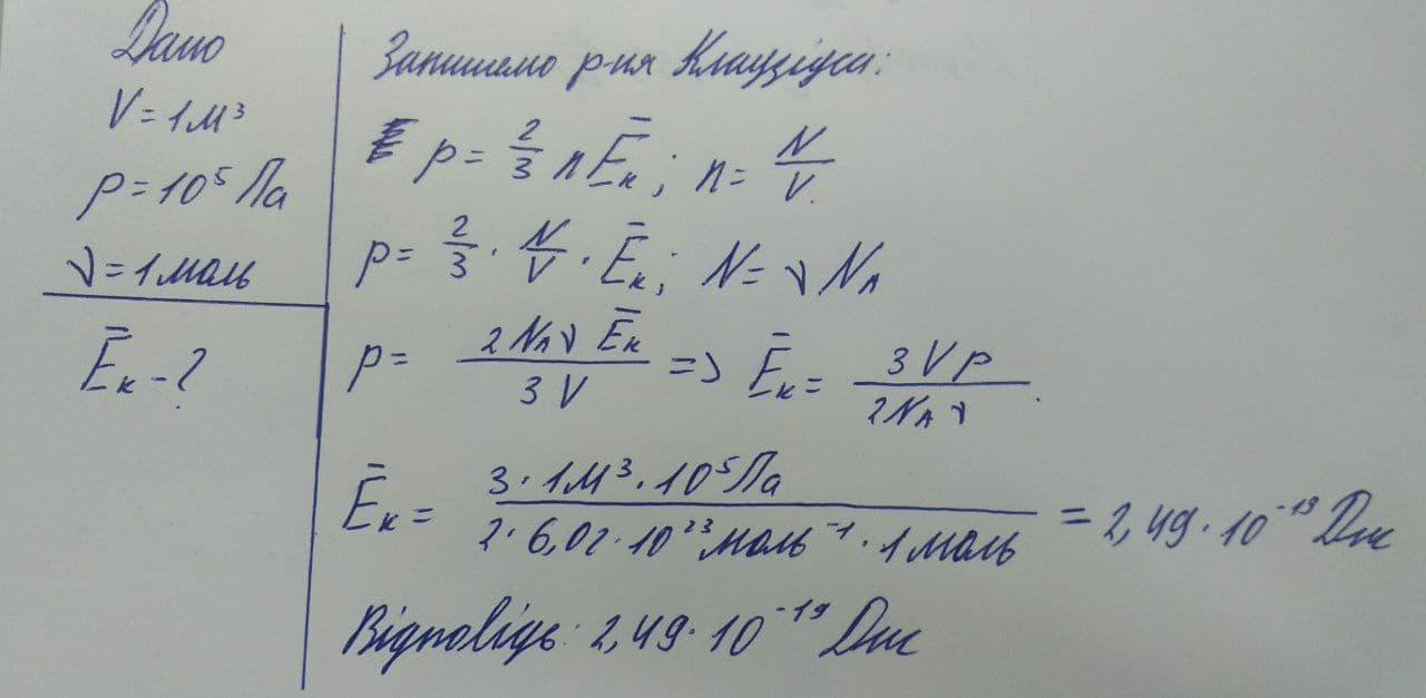 у посудині об'ємом 1м³ під тиском 10⁵Па знаходиться газ кількість речовини якого 1 моль яка середня кінетична енергія поступального руху цього газу помогите пожалуйста я дерево в физике