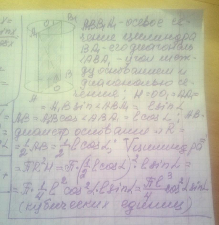 100 БАЛІВ. Найдите объем цилиндра, если диагональ его осевого сечения равна l и образует угол альфа с плоскостью основания цилиндра.