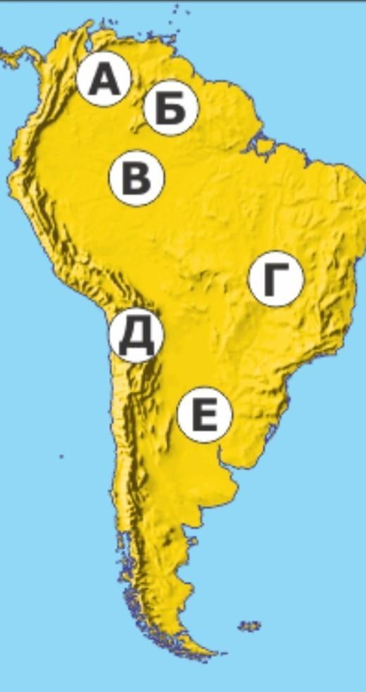 На карте буквами показаны формы рельефа южной Америки. Напиши название форм рельефа под буквами е, в