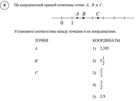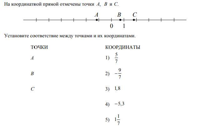 8) На координатной прямой отмечены точки , A B и C. Установите соответствие между точками и их координатами. В таблице под каждой буквой укажите номер соответствующей координаты. Cм. на фото