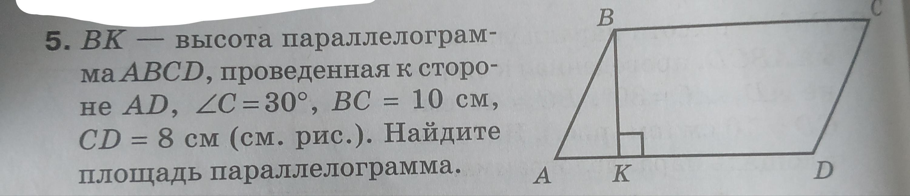 bk высота параллелограмма abcd, проведённая к стороне ad,угол c=30°,bc=10см,cd=8. Найдите площадь параллелограмма.