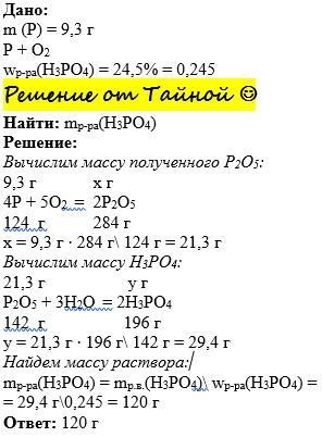 У кисні спалили червоний фосфор массою 9,3. Обчисліть масу розчину ортофосфатної кислоти з масовою часткою 24,5 який можна приготувати використовуючи продукт згорання