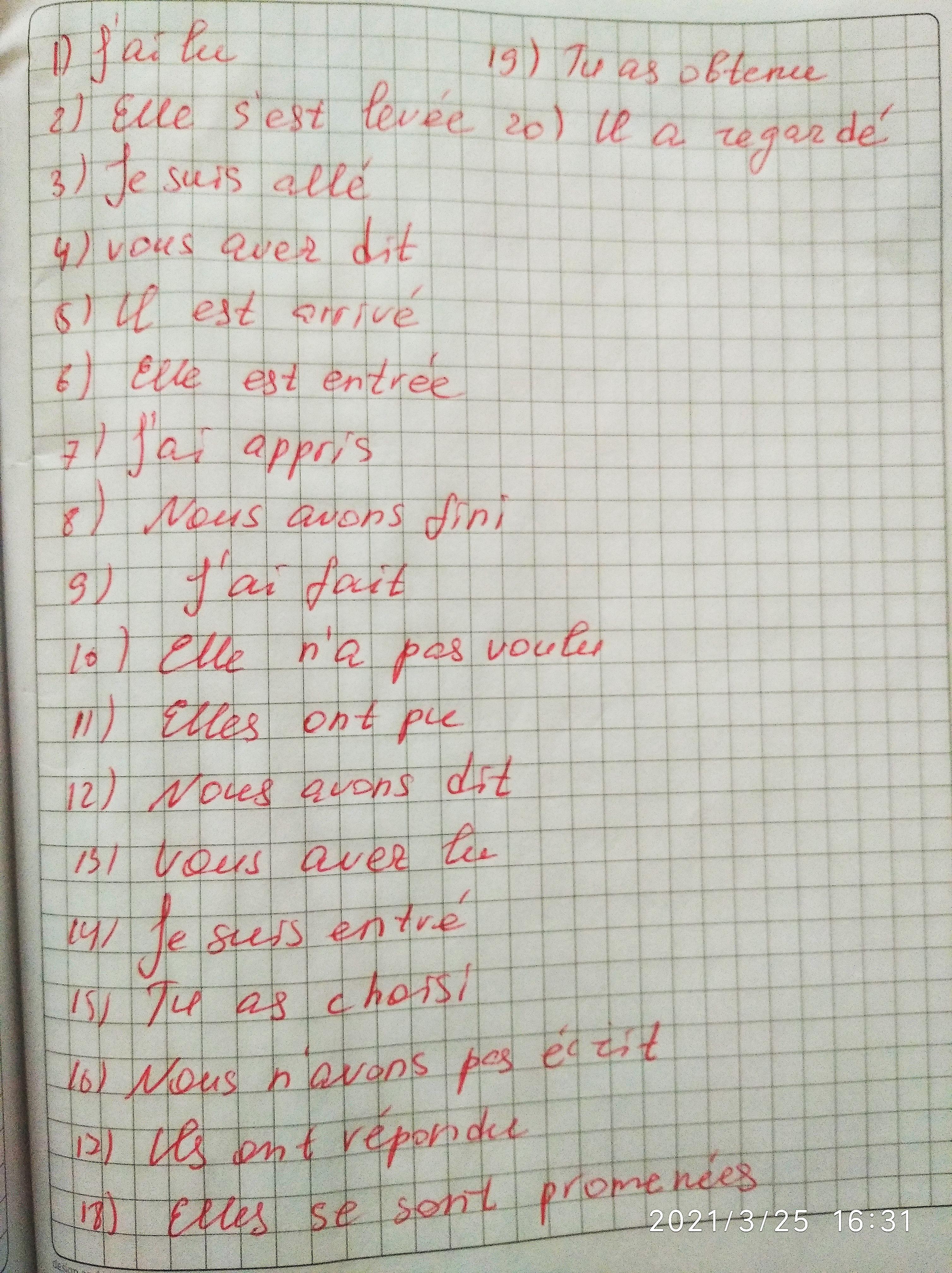 1.Hier, je (lire) un livre français. 2.Nina (se lever) tard. 3.Je (aller) au cinéma. 4.Je ne comprend pas ce que vous (dire). 5.Il (arriver) de Crimée. 6.Elle (entrer) à l’Université. 7.Je (apprendre) cette nouvelle trop tard. 8.Nous (finir) nos cours à quatre heures. 9. Je (faire) de la gymnastique. 10.Elle ne (vouloir) pas aller avec moi. 11.Elles (pouvoir) traduire ce texte sans dictionnaire. 12.Nous (dire) la vérité. 13.(Lire)-vous ce livre intéressant ? 14.Je (entrer) dans ma maison et je (prendre) un ascenseur. 15.(Choisir)-tu un bon livre pour l’anniversaire de ton ami ? 16.Nous ne (écrire) pas une lettre à notre ami. 17.Nicole et Mari (répondre) à toutes les questions du professeur. 18.Hier soir elles (se promener) ensemble. 19.Tu (obéir) toujours à tes maîtres. 20.Le maître (regarder) le tableau.
