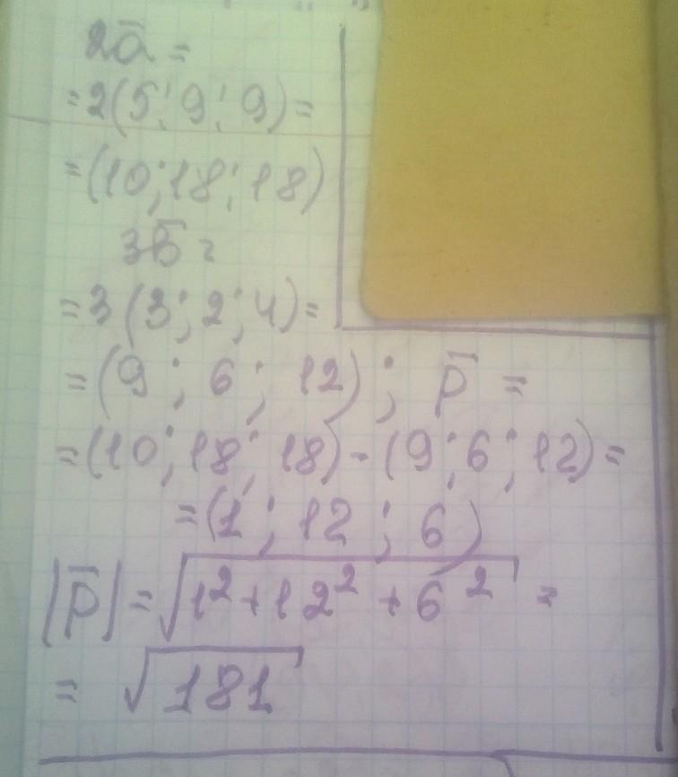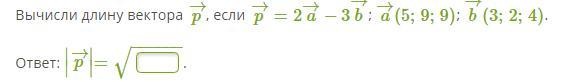 Вычисли длину вектора p→, если p→=2a→−3b→; a→(5;9;9); b→(3;2;4).