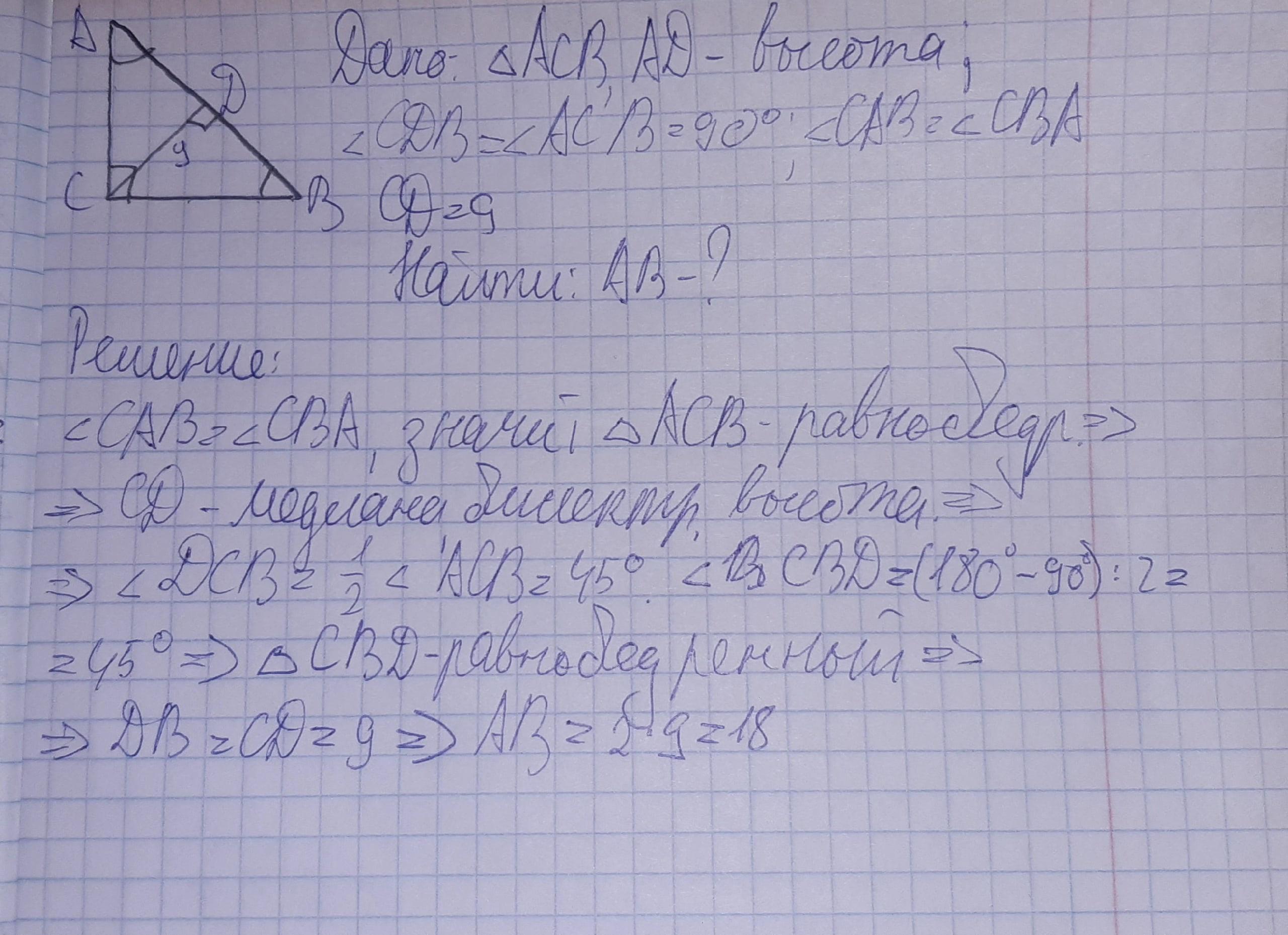 Свойство равнобедренного прямоугольного треугольника: медиана равна половине гипотенузы.