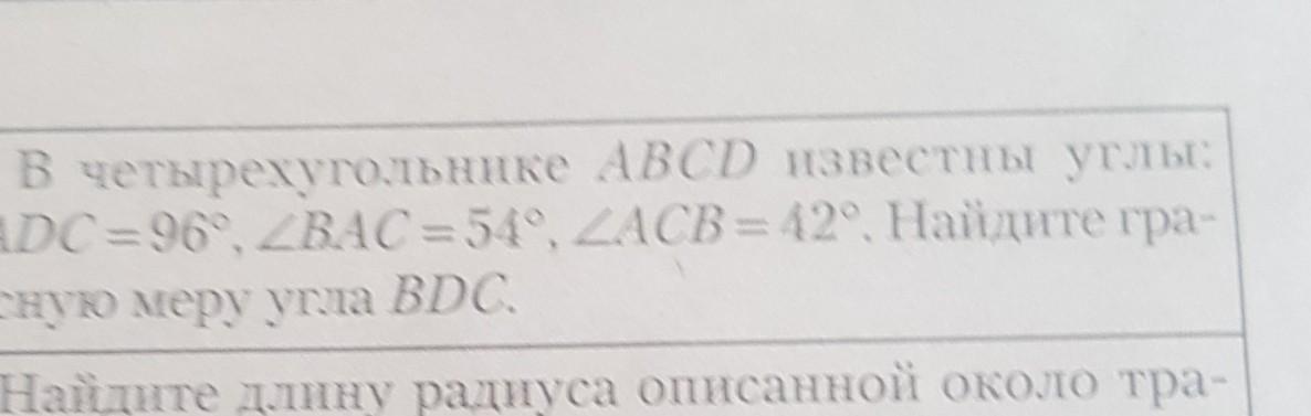 в четырехугольнике ABCD известны углы ADC=96 BAC=54 ACB=42 Найддите градусную меру яBDC
