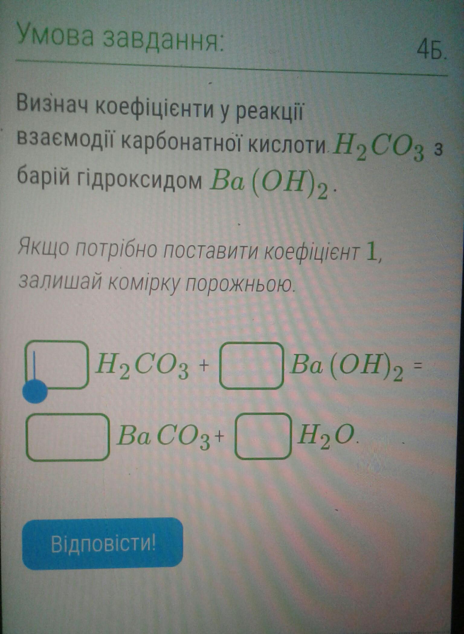Визнач коефіцієнти у реакції взасмодії карбонатної кислоти НаСОз з барій гідроксидом Ва (ОН)2. Якщо потрібно поставити коефціент 1, залишай комірку порожньою.