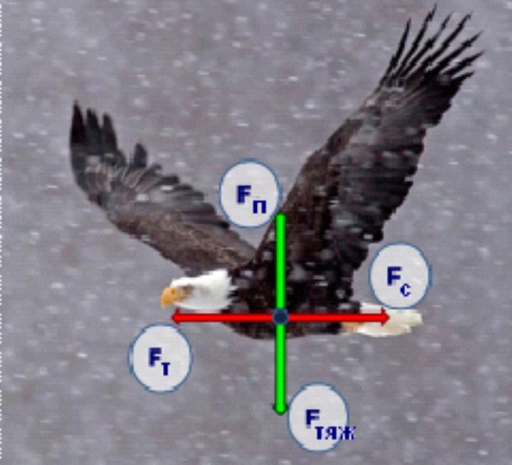 На птицу действуют 4 взаимно перпендикулярные силы.