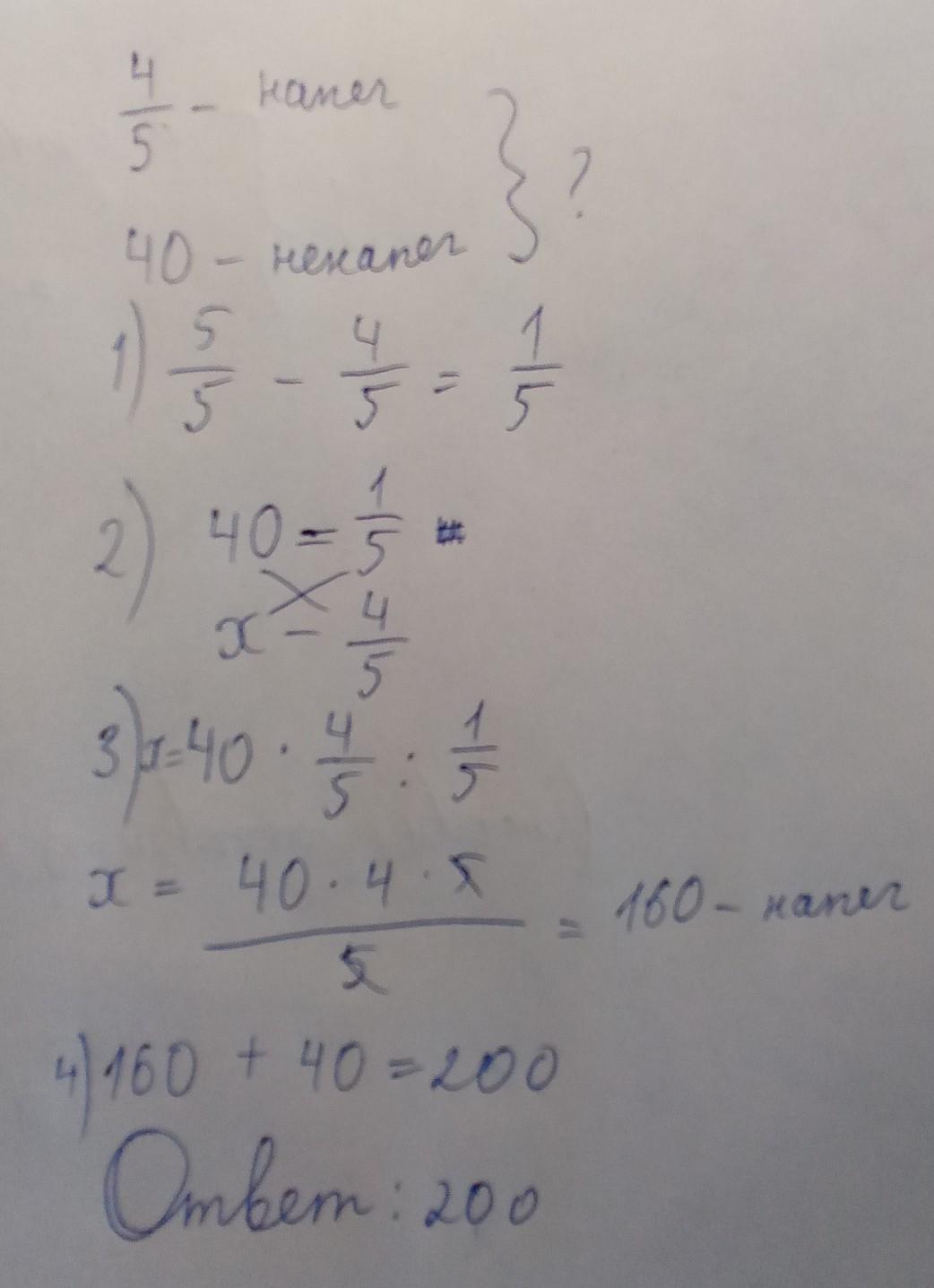 После того как напечатали 4/5 фотографий с праздника, осталось напечатать ещё 40 фотографий. Сколько всего фотографий было сделано на празднике?