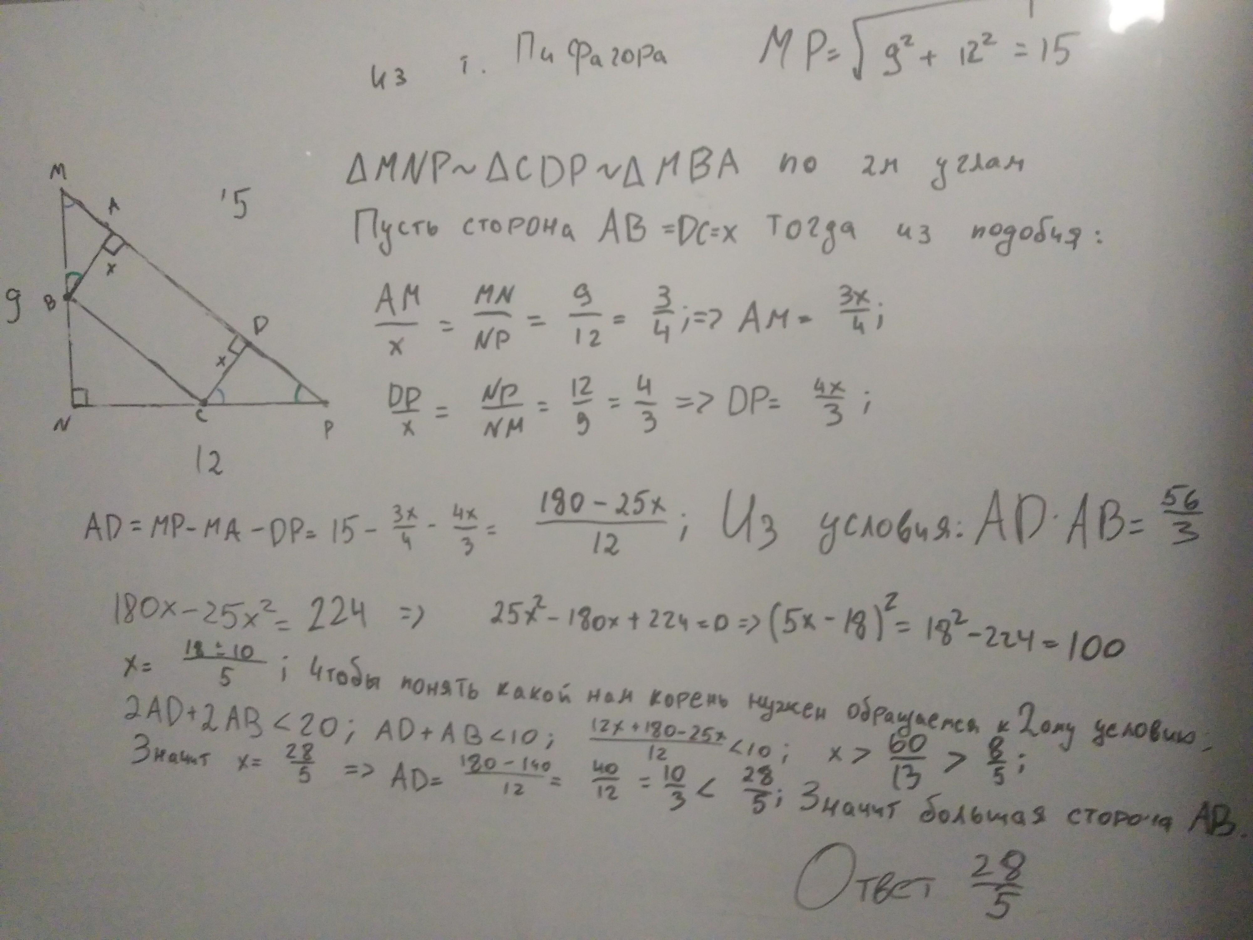 Прямоугольник ABCD находится в треугольнике MNP. Сторона AD прямоугольника лежит на стороне MP, а вершины B и C – на сторонах MN и NP соответственно. Треугольник является прямоугольным, причем катет MN равен 9, а катет NP – 12. Тогда большая сторона прямоугольника ABCD, если его площадь 56/3 , а периметр меньше 20, равна...