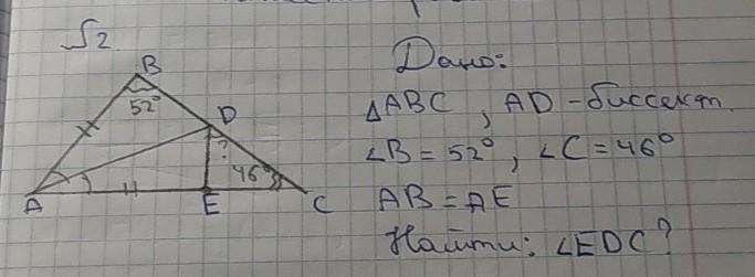 тр-ки ABD и AED равны. угол EDC=180-46-128=6