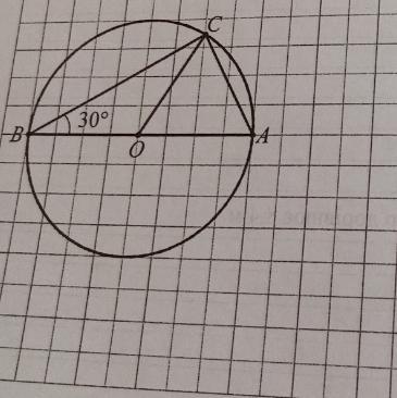 У колі, зображеному на рисунку, АВ діаметр, ABС — 30°, хорда AC-5 смЗнайдіть довжину діаметра АВ та градусну міру кута САВ.