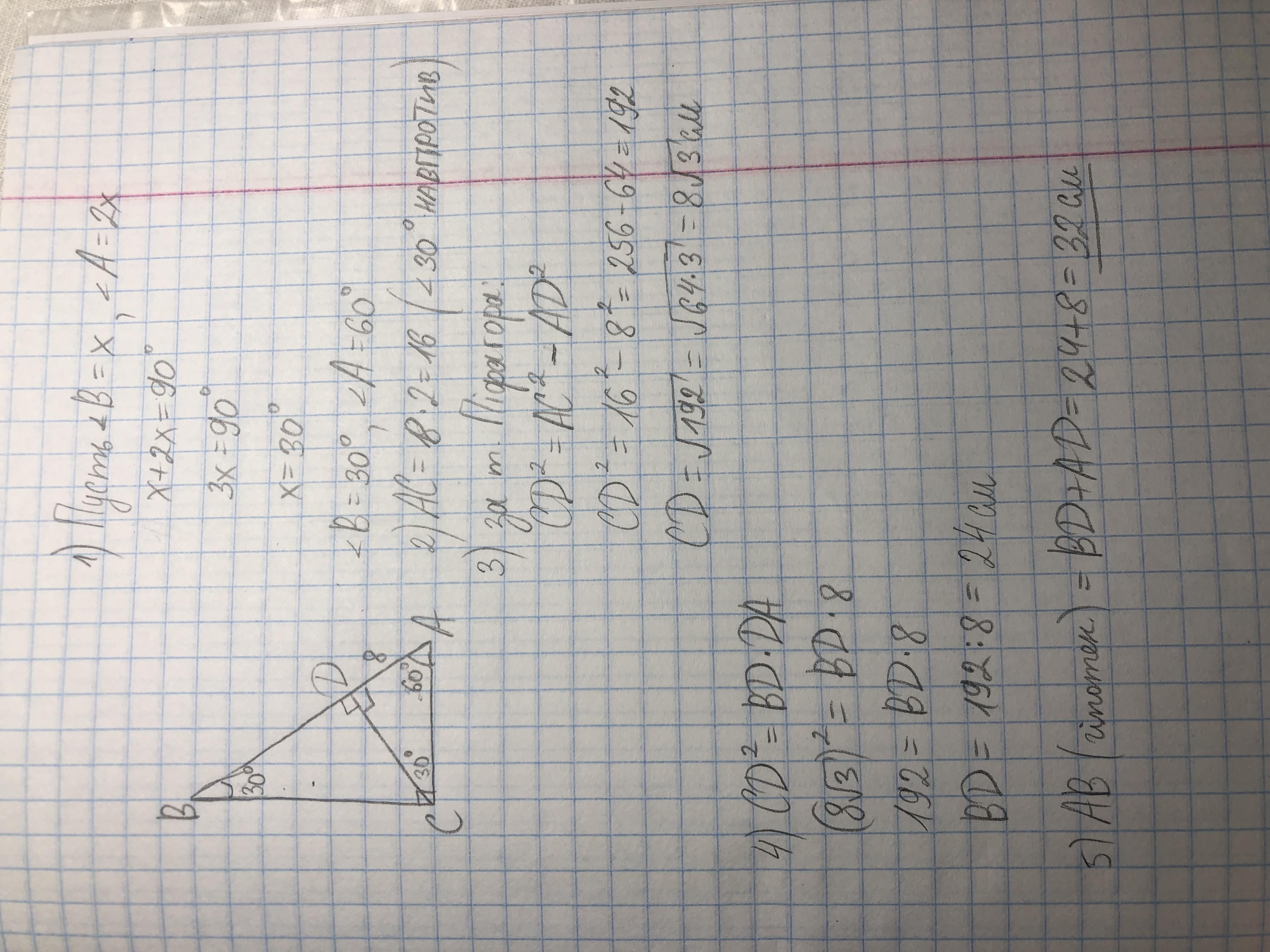 2Х = 60 = ∠В ⇒ по свойству катет лежащий против ∠=30 равен половине гипотенузы.