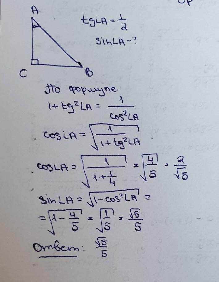 1+tg^2x=1/sin^2x; 1+1/4=1/sin^2x; sin^2x=4/5; sinx=2/корень из 5