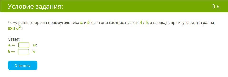Чему равны стороны прямоугольника a и b, если они соотносятся как 4 : 5, а площадь прямоугольника равна 980 м2?