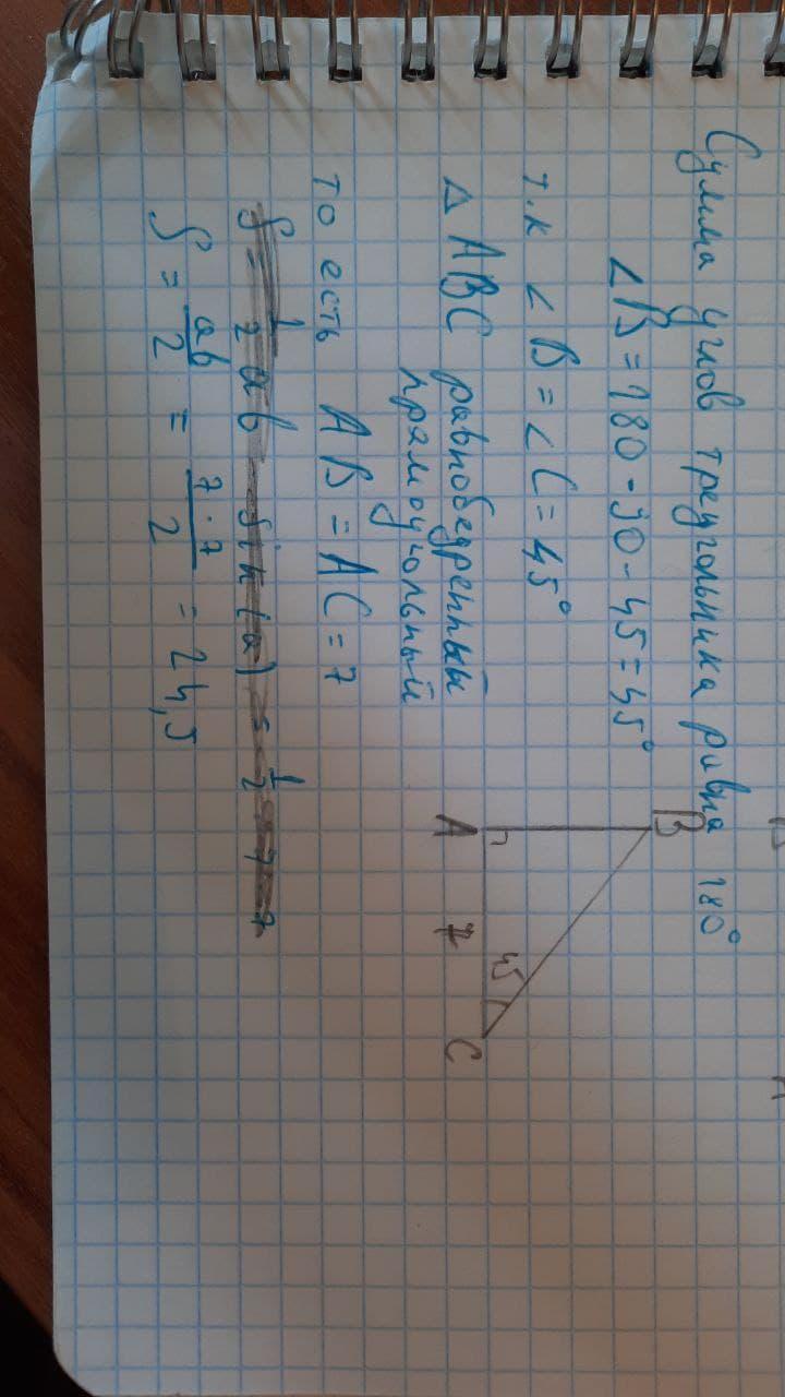 в прямоугольном треугольнике один из катетов равен 7,а угол лежащий напротив него, равен 45 градусов. Найдите площадь треугольника.