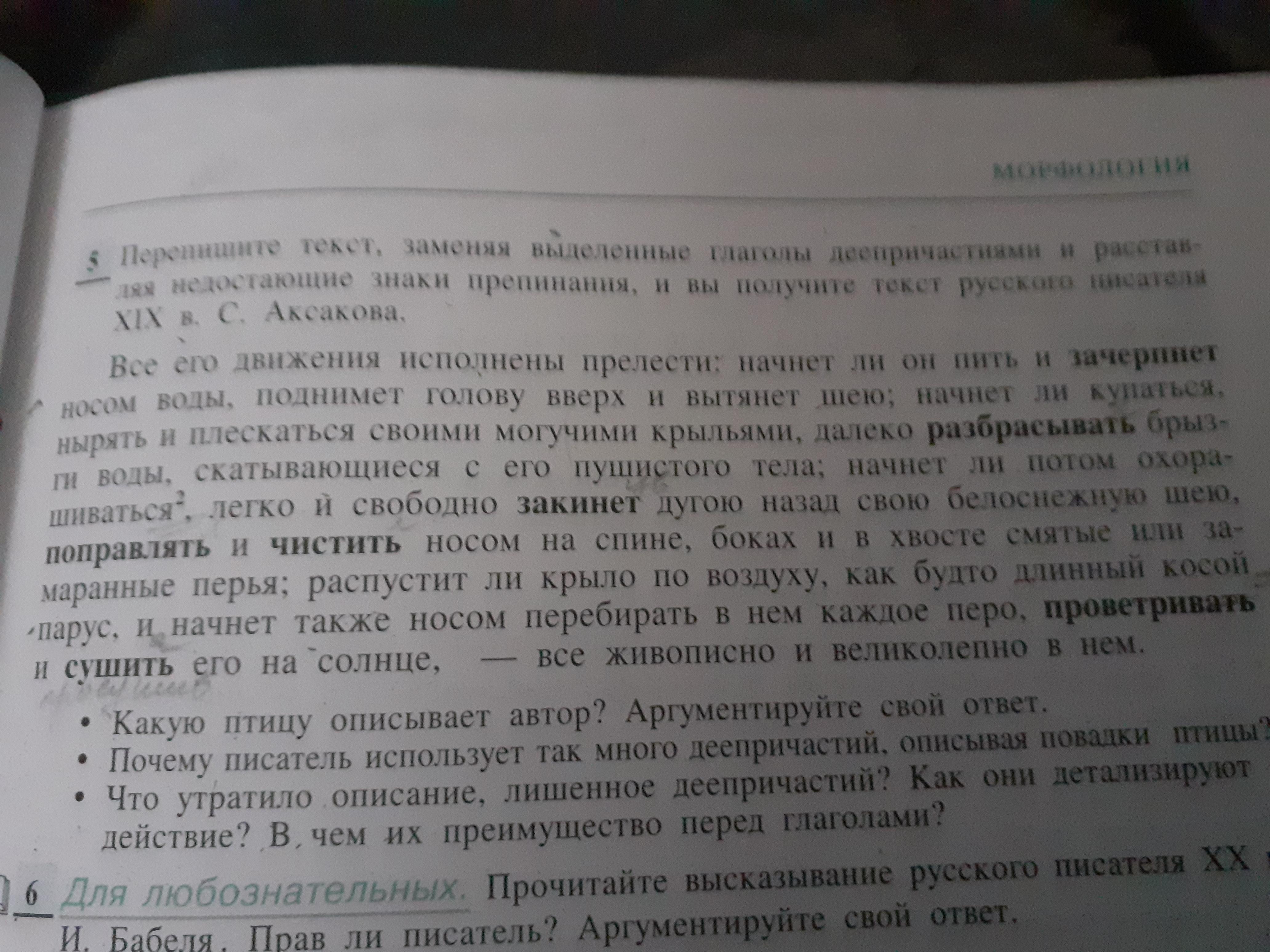 Но и все его движения исполнены прелести: начнёт ли он пить и, зачерпнув носом воды, поднимет голову вверх и вытянет шею; начнёт ли купаться, далеко забрасывая брызги воды, скатывающейся с его пушистого тела; начнёт ли потом охорашиваться, легко и свободно закинув дугою назад свою белоснежную шею, поправляя и чистя носом на спине, боках и в хвосте смятые или замаранные перья; распустит ли крыло по воздуху, как будто длинный косой парус, и начнёт также носом перебирать в нём каждое перо, проветривая и суша его на солнце, - всё живописно и великолепно в нём.