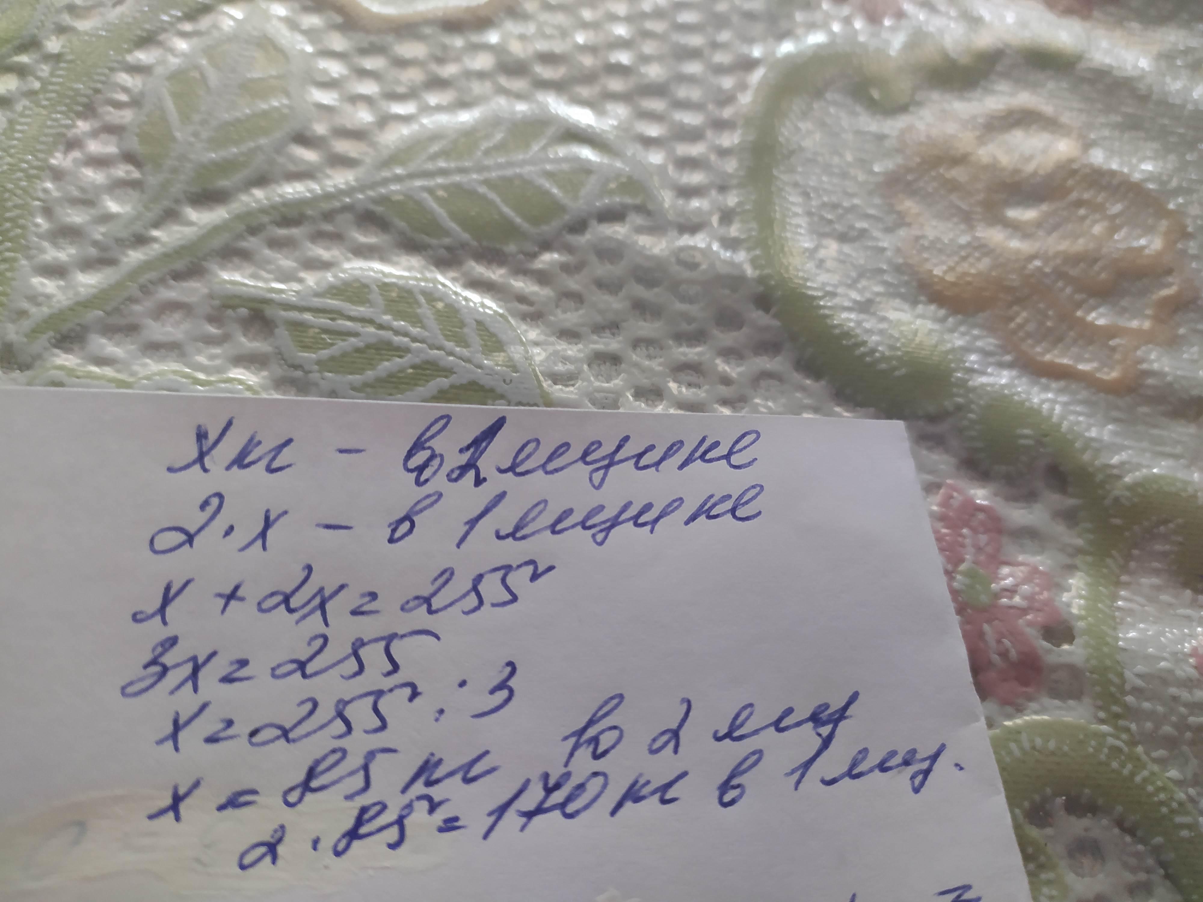 в двух ящиках 255 кг апельсинов. В первом ящике в 2 раза больше, чем во втором. Сколько апельсинов во втором ящике?